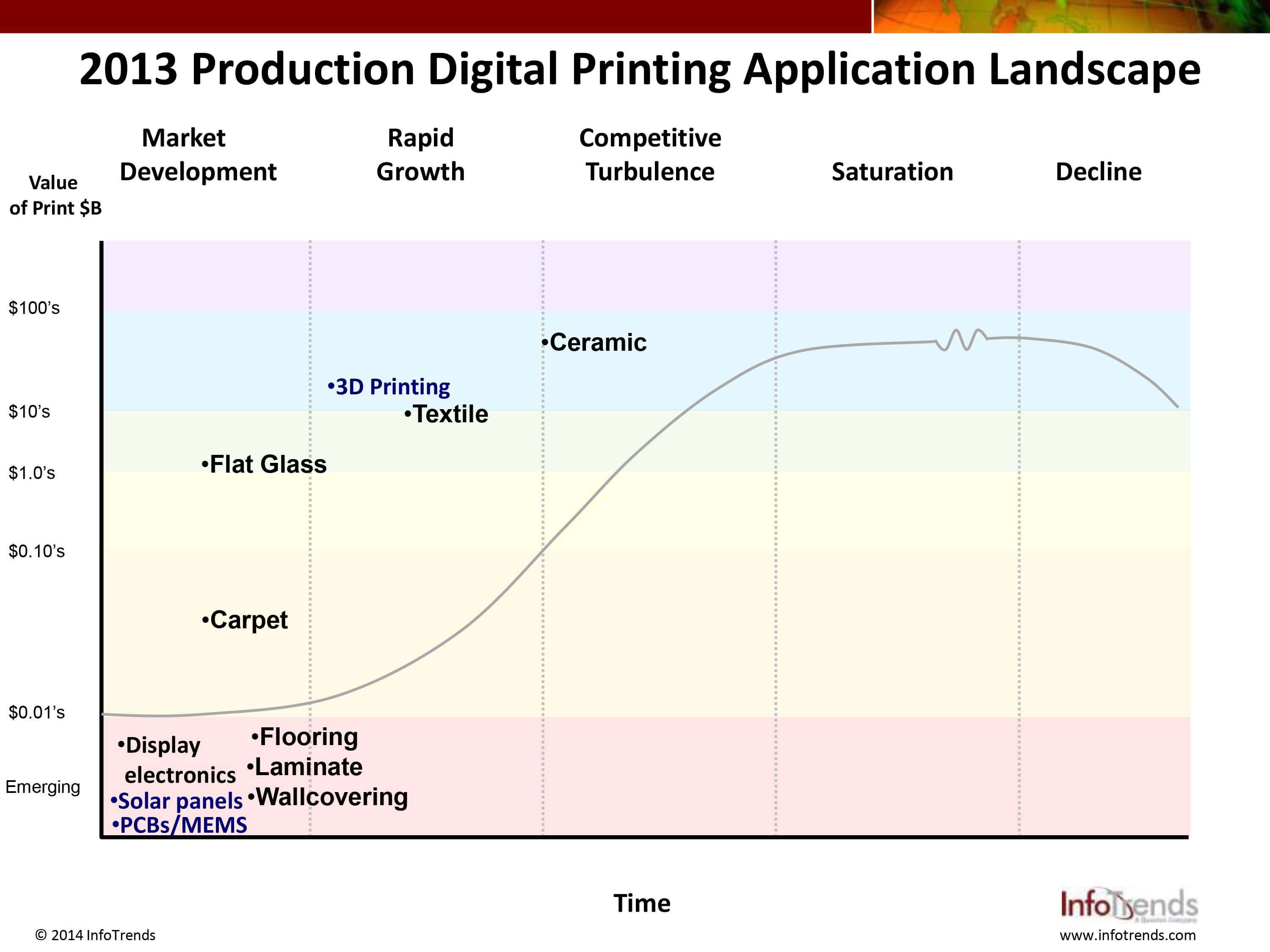 Una caratteristica che accomuna tutti questi segmenti è il posizionamento che hanno nel panorama generale della stampa. Tradizionalmente un mercato vive cinque fasi: sviluppo, forte crescita, turbolenza, saturazione, declino. La stampa su ceramica è l’unica ad essere nella terza fase (peraltro appena entrata e con ancora ampi margini di crescita). Stampa 3D e textile si pongono nella seconda fase, mentre tutto il resto (vetro piano, wallcovering, laminati, pavimenti,…) è nella prima fase. Stiamo quindi parlando di mercati ancora in fase embrionale, in cui pochi player si spartiscono lo share e dove si sta cercando di trovare una sua direzione ben precisa.