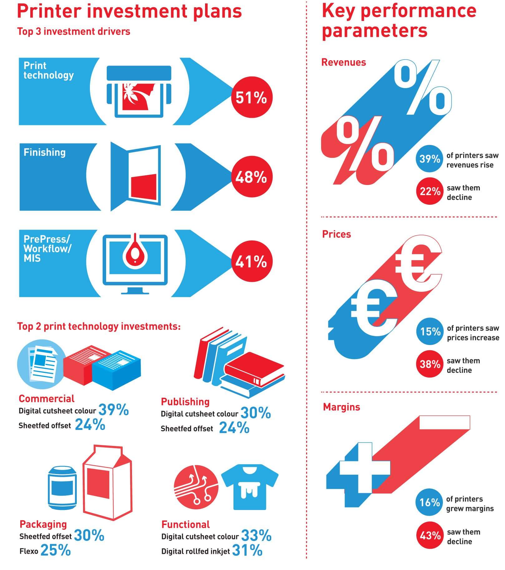 drupa ha rilasciato i risultati della seconda uscita del suo Global Trends report, condotta a ottobre 2014, dai quali emerge un quadro di sorprendente ottimismo del settore della stampa. Un risultato di rilievo, in particolare se si considera che lo schema della survey era identico a quello condotto sempre da drupa un anno prima, che era stata oggetto del primo Global Trends report a febbraio 2014. La domanda "Come vedi i prossimi dodici mesi?" ha visto ben il 48% dei service provider affermare un'aspettativa di crescita economica e solamente il 7% un calo. Analoga la situazione nel mondo dei fornitori: 51% in attesa di crescita, solo 8% in calo.